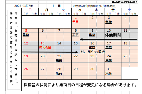 1月 漁期・集荷日カレンダー(下記をクリック)