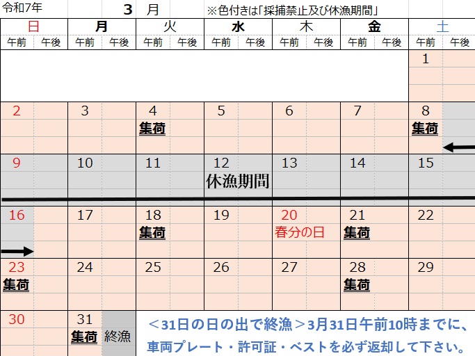 3月 漁期・集荷日カレンダー(下記をクリック)